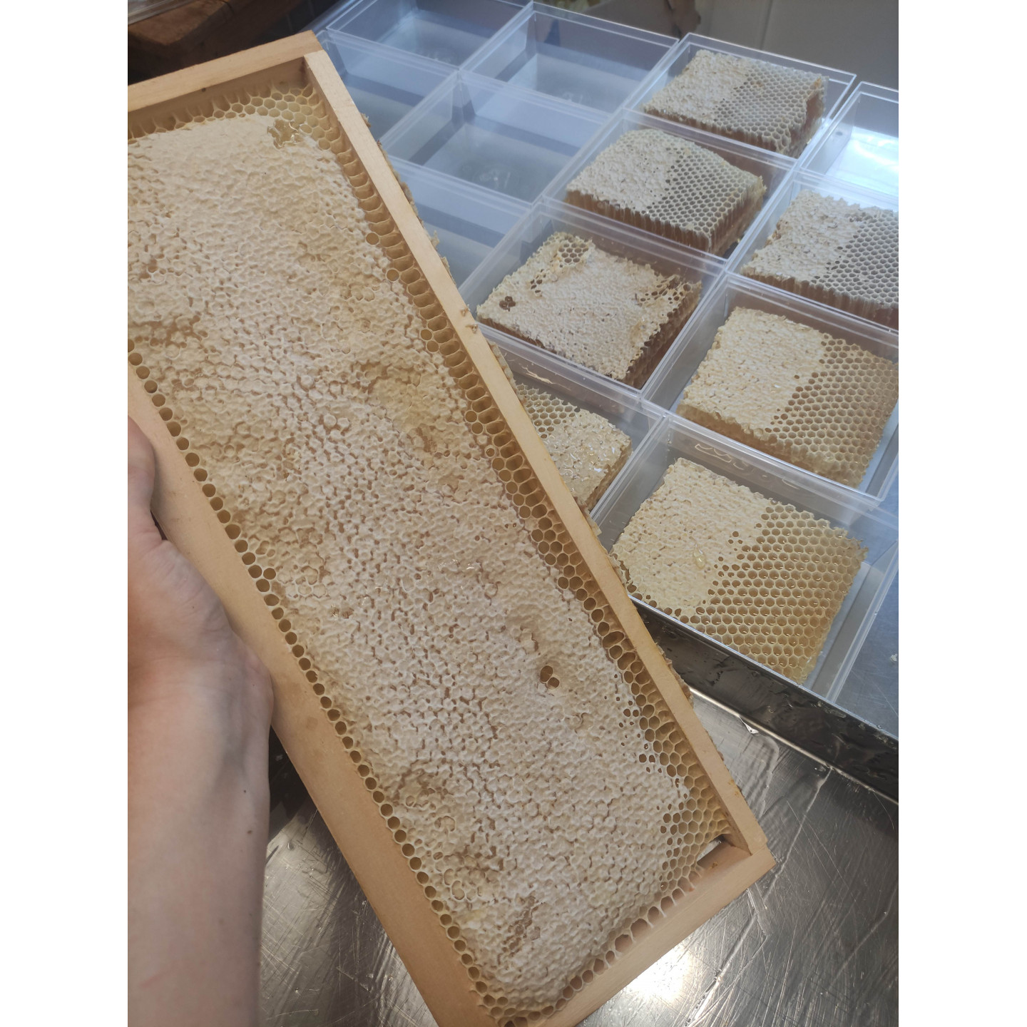 Le miel en rayon est découpé directement dans les cadres des hausses après la récolte puis mis dans son conditionnement de vente. Il n'y a donc pas de processus d'extraction ni aucune intervention de l'apiculteur.