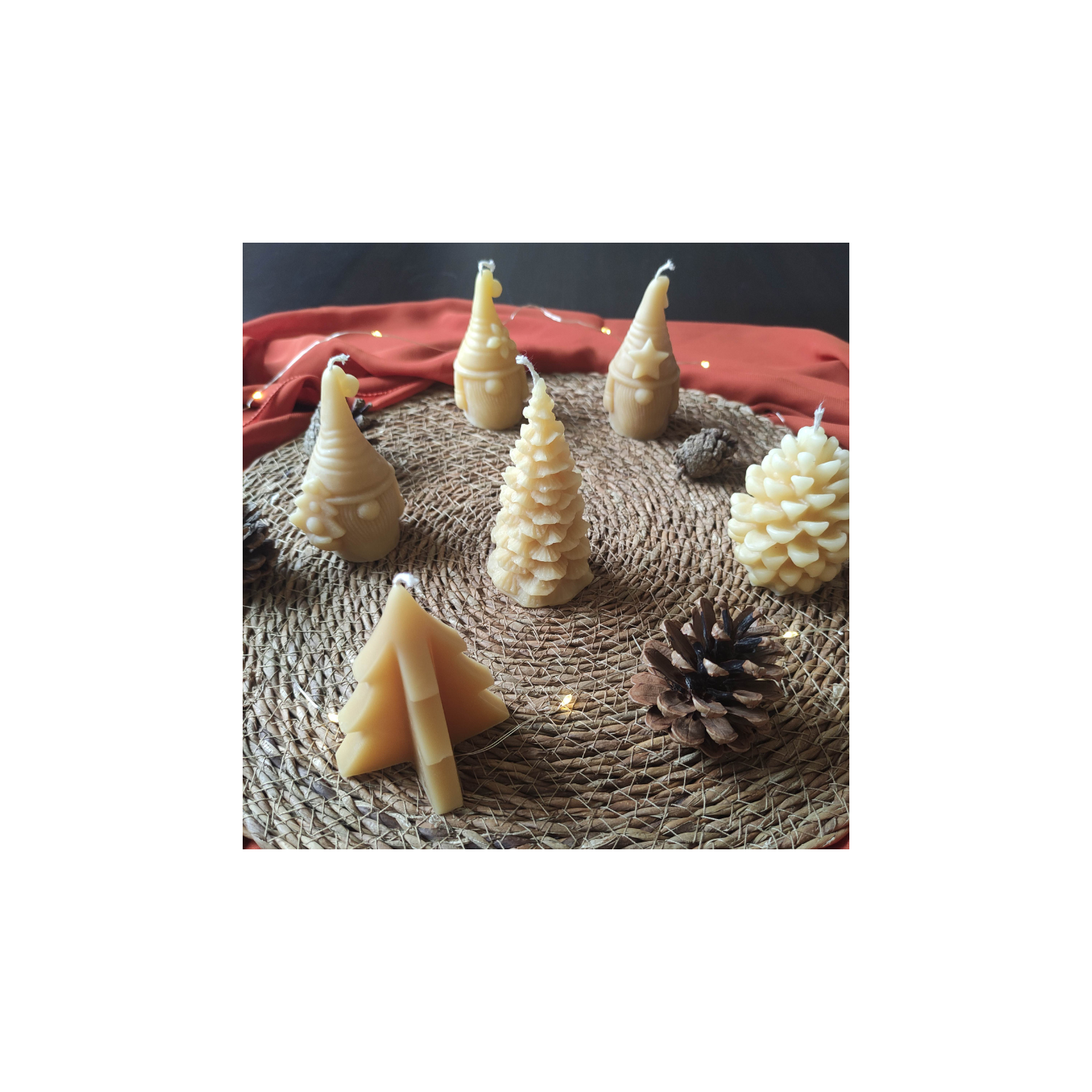 Petits bougies artisanales en cire d'abeille vendues par 3. Choisissez trois bougies parmi notre offre : petits lutins, sapins, pomme de pin. Nos bougies sont fabriquées artisanalement par nos soins dans notre miellerie avec la cire de nos abeilles. Elles sont respectueuses de l'environnement et de votre intérieur.