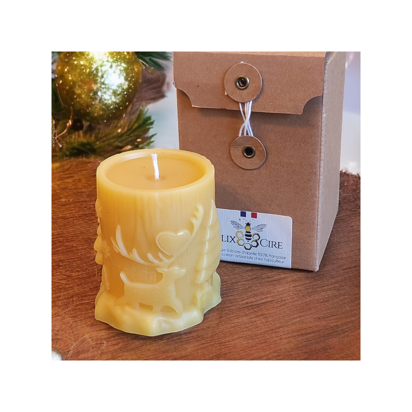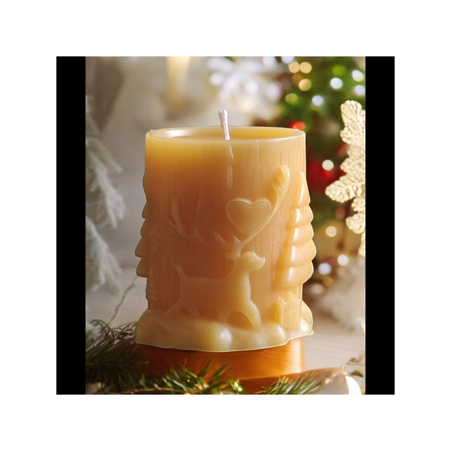 Bougie sculptée avec des illustrations de Noël, idéale pour célébrer les fêtes de fin d'année. Cette bougie écologique diffuse une odeur délicate et apaisante distinctive de cire d'abeille.