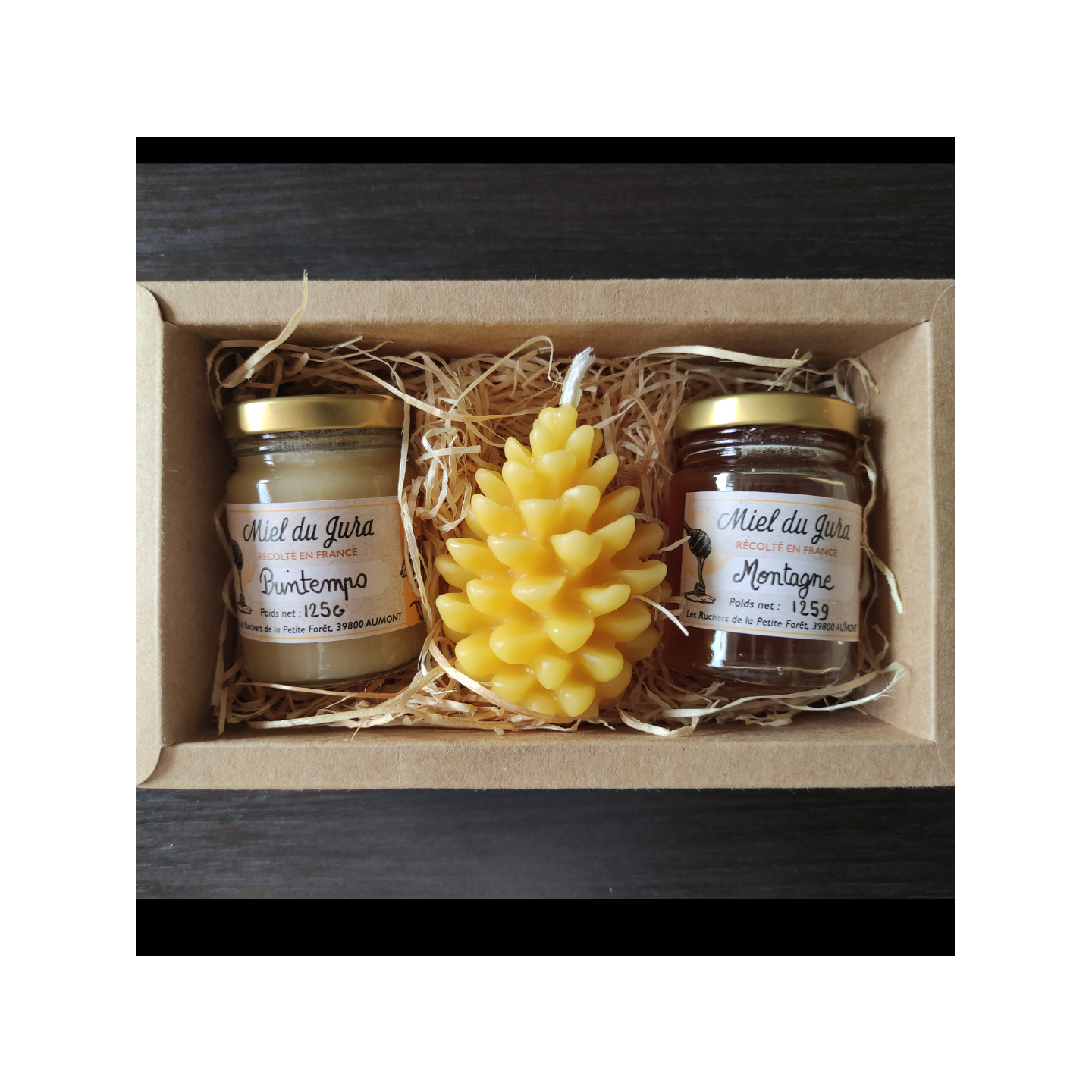 Offrez un cadeau gourmand et original à vos proches ! Ce coffret cadeau est composé de 2 miels du Jura et une bougie en cire d'abeille. Un cadeau artisanal, 100% en direct du producteur.