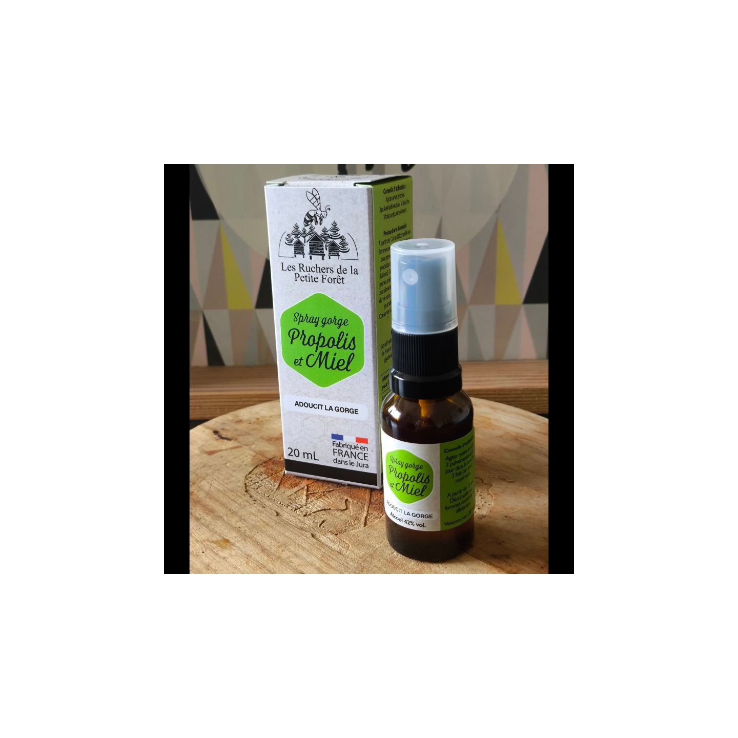 Notre spray pour la gorge Propolis et Miel apaise les voies respiratoires, adoucit la gorge et soulage des petits maux d'hiver. Il est réalisé par nos soins dans notre laboratoire avec la propolis et le miel récoltés dans nos ruches jurassiennes.
